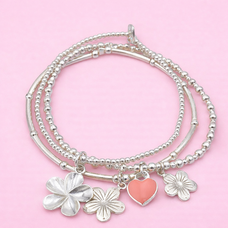 Deze prachtige set bestaat uit drie armbandjes, allemaal versierd met het nieuwe hibiscus bedel. Gemaakt van 925 sterling zilver en geregen op stevig 0,8 mm Beadalon-elastiek, is deze set perfect voor een zomerse look!