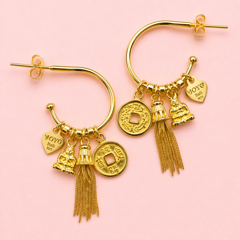 Deze Mini Amar oorbellen van Joy Jewellery Bali Gemaakt van Gold plated met een elegante 3 cm lus, en versierd met drie good vibe (luck) Joy-bedels én het kenmerkende kleine Joy-logo tag.