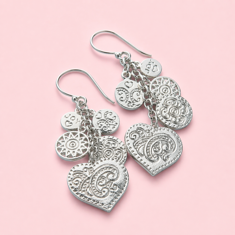 Long zilver 925 handmade earrings with little coins and JOY hearts.