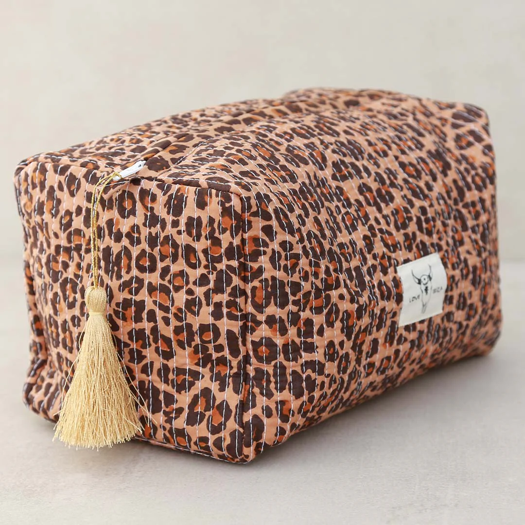 In deze blockprint katoenen toilettas met luipaard print kun je al je toiletartikelen en makeup overal mee naartoe nemen. Deze toilettas met ristssluiting is gemaakt van organisch katoen heeft een gecoate binnenvoering met 4 binnenvakjes.